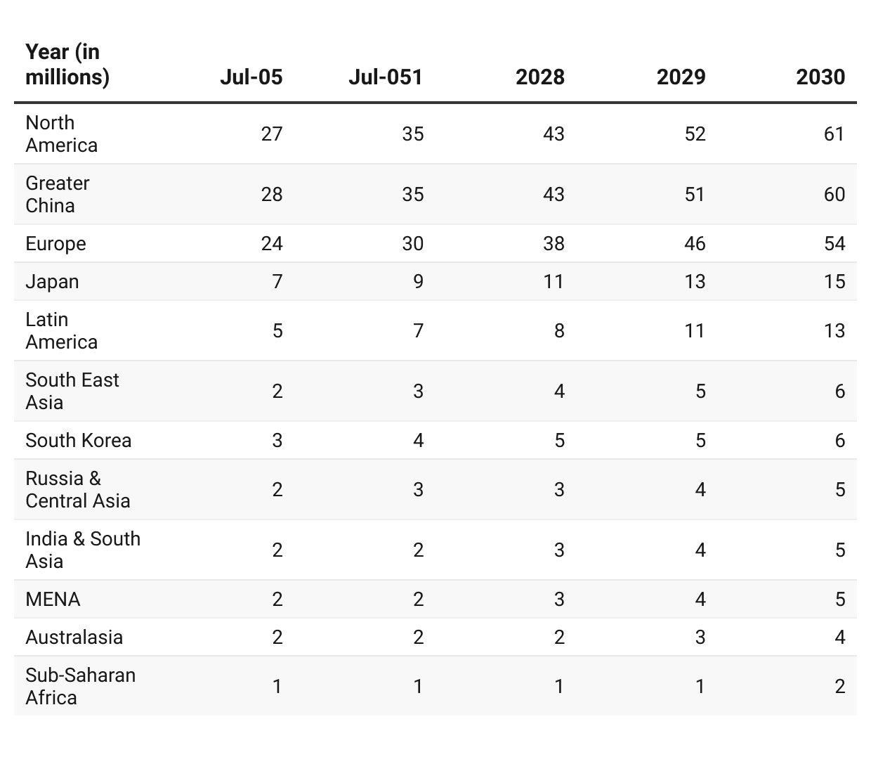 - South Korea contributes 3 million, whereas India and South Asia, along with the MENA region and Australasia, each account for 1 million.