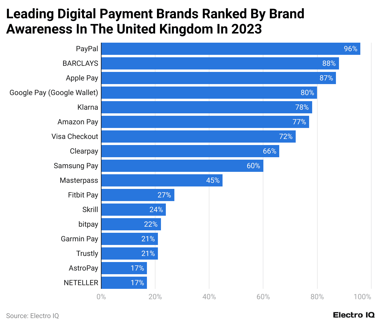 - BARCLAYS, Apple Pay, and Google Pay are other popular digital payment systems in the United Kingdom, with 88%, 87%, and 80% acceptance among the respondents, respectively.