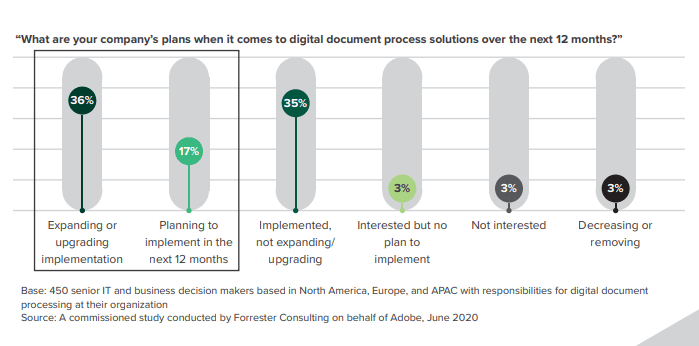- E-signature and Digital Document Statistics show that expanding or upgrading implementation is the company’s plan regarding digital document process solutions, as per 36% of respondents.