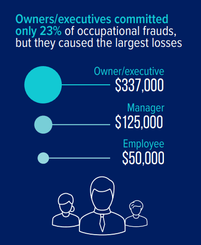 Owner/executive level fraud causes the highest median losses, at USD337,000 per incident.