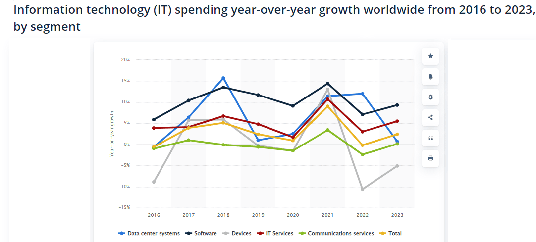 - The spending in the IT industry has been consistently increasing. The expenditure can be classified into data center systems, devices, software, IT, and communication services.