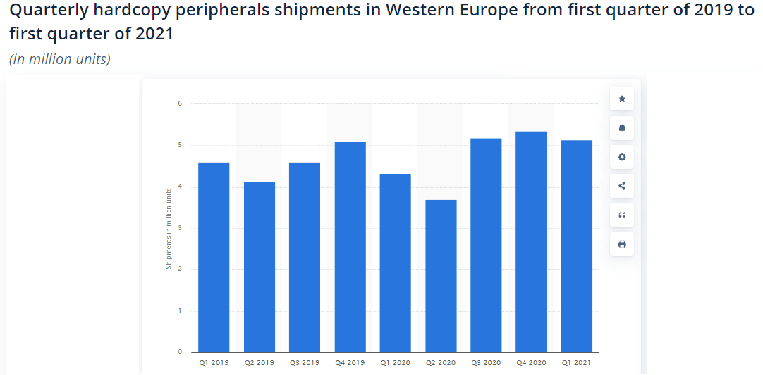 - In 2020, there was a high growth rate of 11.58% in terms of revenue of printers and copiers worldwide.