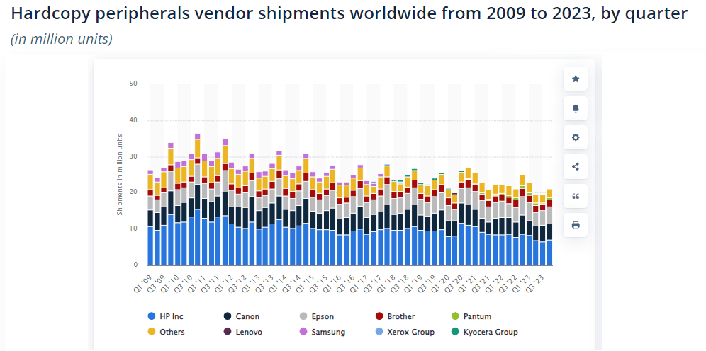 - By the end of 2023, there was $9.69 billion in revenue from the printer and copier industry.