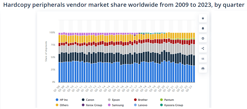- The printed electronic statistics reveal that HP consistently has the highest market share among the hardcopy peripheral providers.