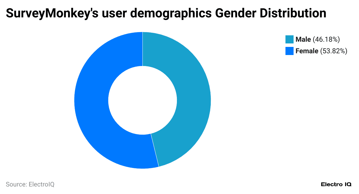 • Some very interesting trends emerge from considering SurveyMonkey’s user demographics. In terms of gender distribution, females form a slight majority with 53.82% of the users, while males make up 46.18%, meaning the audience is fairly balanced but leaning toward the female side.